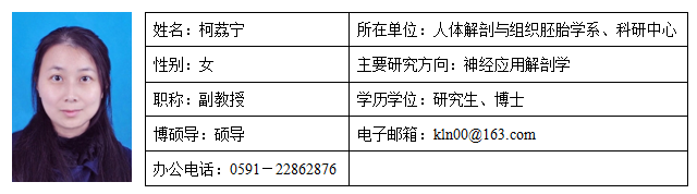 柯荔宁,女,1977.7,中共党员,医学博士。2008年7月毕业于a片动画 神经病学专业取得医学博士学位,2012-2014年于南方医科大学完成博士后研究。现任a片动画 科研中心主任,人体解剖与组织胚胎学系副教授。