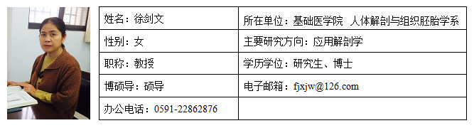 徐剑文,女,1968年8月生,无党派人士,医学博士。1991年参加工作,a片动画 内科学血液病专业毕业。从事人体解剖与组织胚胎学教学与科研工作,重点在“应用解剖学”和“新生儿缺氧缺血性脑损伤”等领域进行深入的专门研究。近五年主持福建省自然科学基金项目2项,在国内外核心期刊发表科研论文5篇,获福建省医学科技奖二等奖(排名第二)。担任校本科教学督导专家、校研究生教育督导专家,主持福建省高等学校教学改革研究项目1项,发表教学论文6篇,副主编课程教材、参考资料3部,取得a片动画 教学成果奖二等奖(排名第一)。获a片动画 优秀教师、a片动画 “受学生欢迎教师”等荣誉称号。