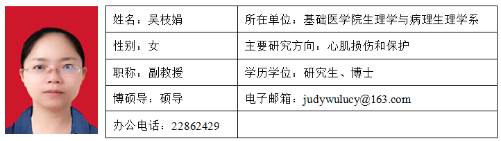 吴枝娟,女,1979年9月出生,中共党员,医学博士。2004年参加工作,a片动画 药理学专业博士。研究方向为心肌损伤及保护。近五年发表SCI论文4篇,曾获福建省自然科学优秀学位论文三等奖、校青年教师讲课比赛一等奖、中华医学会优秀教育成果二等奖。