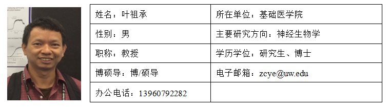 叶祖承,男,1970年1月生,无党派,北京大学学士, 美国阿拉巴马大学神经生物学博士,曾任华盛顿大学(西雅图)博士后、助理教授。2011年入选福建省“闽江学者”并任a片动画 教授、博士生导师, 2018年全职回国工作。长期从事神经生物学科研工作,尤其是神经胶质细胞方面的研究。主要研究领域为神经胶质细胞与神经胶质瘤细胞的神经递质转运与代谢、离子通道与缝隙蛋白半通道的功能与特性、能量代谢与调控、以及神经胶质细胞在情感与认知中的作用。常任《Journal of Neuroscience》, 《Glia》,《Journal of Neurochemistry》等杂志审稿人。研究项目先后获“美国NIH 基金” “国家自然科学基金”等的资助。研究成果取得美国授权专利两项,在《Cancer Research》、《Journal of Neuroscience》、《Glia》等学术期刊及国际会议上发表学术论文40余篇,在胶质瘤谷氨酸释放与缝隙蛋白半通道领域做出过开创性研究成果,相关论文SCI他引两千余次,单篇引用500余次。