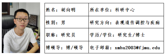 胡向明,男,1985年1月出生,理学博士,研究员,博士生导师。福建省“闽江学者”特聘教授,福建省高层次引进人才。博士毕业于厦门大学,在美国伊利诺伊大学厄巴纳-香槟分校(UIUC)进行博士后研究。主要研究方向为表观遗传调控与疾病,结合临床样本和分子生物学、细胞生物学以及实验动物模型探讨表观遗传因子BRD4在肿瘤和炎症性疾病中的作用机制及相关疾病的靶向治疗。研究成果以通讯作者或第一作者身份在JCI insight、Oncogene、Nucleic Acids Research、Journal of Biological Chemistry和Cell Death Disease(2篇)等学术期刊发表论文。