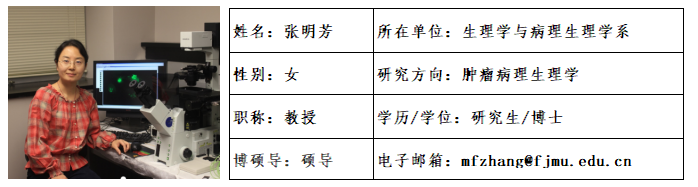 张明芳,女,1973年9月生,山西曲沃人,医学博士,教授,硕士生导师,现任a片动画 生理学与病理生理学系主任。研究兴趣为心血管病理生理学(利用动物模型和细胞模型,研究炎症因子和细胞自噬在肺动脉高压中的分子功能)和肿瘤病理生理学(综合使用生物信息学分析、细胞分子生物学和药理学实验手段,寻找癌症的新诊断和治疗靶点并开展相关基础研究)。先后主持人力资源与社会保障部留学回国人员基金、福建省自然科学基金、福建省教育厅重点项目、福建省卫计委人才项目等课题多项。近年来在Cancer Res、OncoImmunology、J Biol Chem、Am J Physiol Cell Physiol、Sci Rep、Exp Toxicol Pathol、生理学报、中国药理学通报等学术期刊上发表研究论文。参编《图表生理学》、《基础医学概论》、《医学机能学实验》等教材。指导研究生11人,其中9人已顺利毕业,现有2人在读。