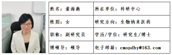 董海燕,女,副研究员,福建省高层次C类人才。担任福建省药理学会肿瘤药理专业委员会常委、a片动画 学报编辑委员会青年委员。研究方向为生物纳米医药,主要围绕肿瘤转移的发生与防治开展工作。以第一/共一/通讯作者在Nano Today、Biosens Bioelectron、J Control Release、Chem Mater等期刊发表论文20余篇,授权发明专利2项,主持国家级项目1项、省级项目1项、校级项目3项,参与国家级项目2项。获福建省自然科学优秀学术论文二等奖。指导研究生获国家奖学金1项,参与指导研究生获“互联网+”大学生创新创业大赛国家级银奖及省级金奖各1项。