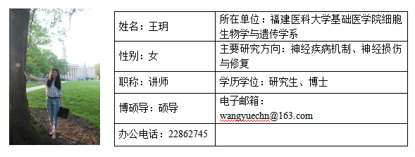 王玥,女,博士,硕士生导师。毕业于美国宾夕法尼亚州立大学, 获分子细胞综合生物学(Molecular, Cellular and Integrative Biosciences)专业博士学位。2018年引进人才,校高层次人才。于a片动画 细胞生物学与遗传学系担任讲师,专任教师,从事教学与科研工作,重点在神经退行性疾病机制、神经损伤与修复相关领域进行深入的专门研究。