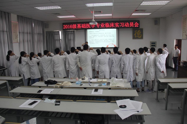 学院领导在实习动员中特别强调了实习生要遵守医院的各项规章制度,要尊敬临床带教老师,学会关心爱护病人,与临床医护及工作人员良好沟通,同时做好自身安全卫生防护,并希望各位同学都能珍惜本次的临床实习机会,通过临床实习把以前所学的医学理论知识与临床实践相结合,为将来的个人发展奠定良好的基础。