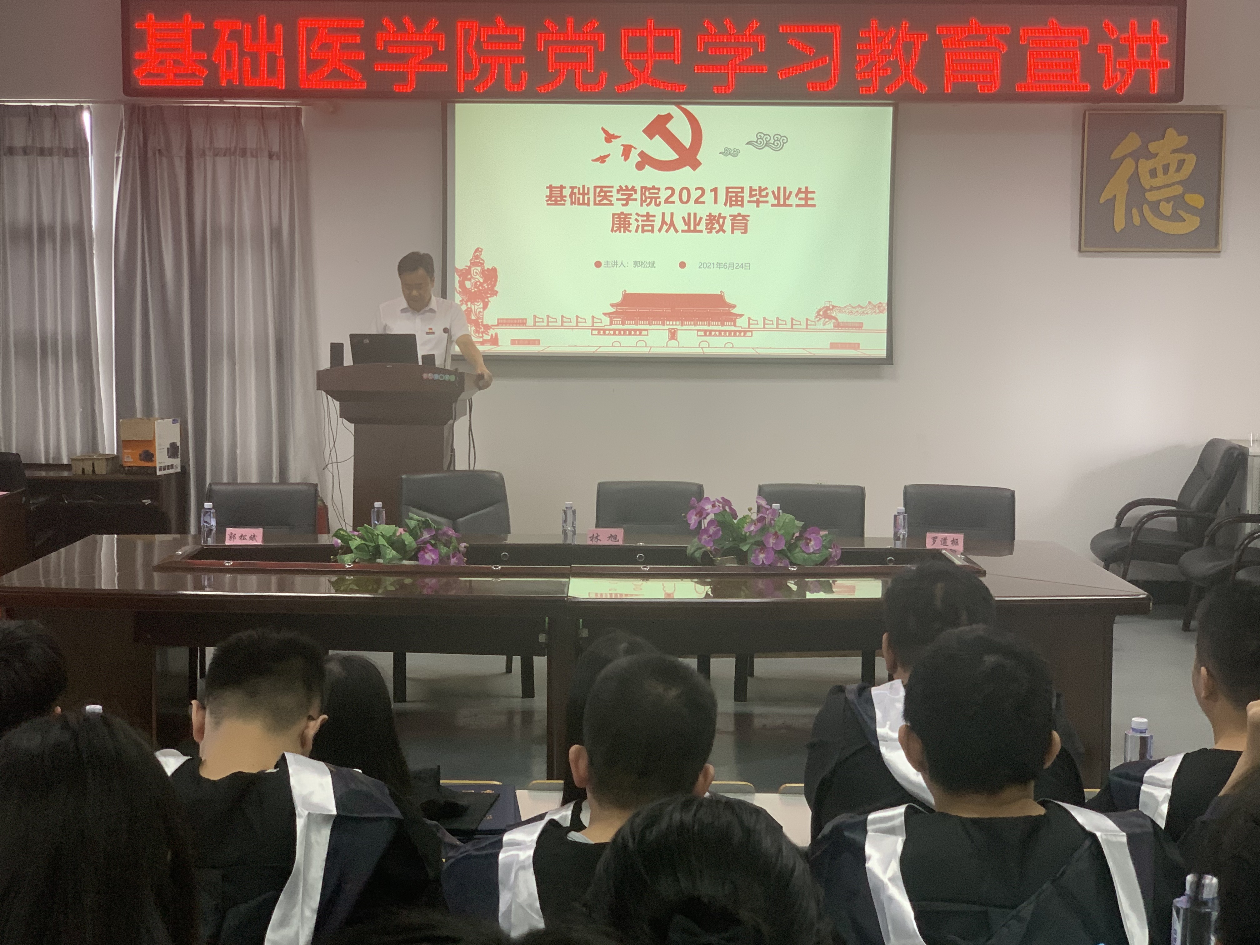 为贯彻落实立德树人根本任务,进一步引导毕业生增强法纪意识,树立崇廉尚德的价值理念,牢筑廉洁从业思想道德防线,走好迈向社会的第一步。6月24日上午,院党委书记郭松斌为2021届全体毕业生讲授“廉洁从业”专题党课。他以尊崇党章、遵守党纪为主要内容,结合案例警示,告诫学生以己所长、奉献社会、廉洁自律、爱岗敬业,清醒面对环境、正确对待权力、谨慎社会交往、诚信科学研究、守住人生底线。引导学生做廉洁之人,行廉洁之事,树廉洁之心。