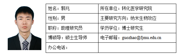 郭兆,男,1993年8月,博士研究生。2020年入职a片动画 转化医学研究院,中国科学院高能物理研究所生物无机化学专业。研究方向为生物无机纳米材料在肿瘤诊疗中的应用。福建省高层次引进人才C类。近五年在Advanced Materials、Advanced Science等期刊发表SCI论文13篇。