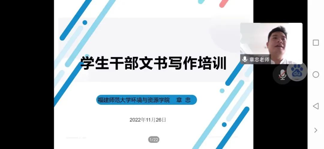 2022年11月27日下午,a片动画 团委组织部举办了团委、学生会新成员培训班第四讲—实用文写作指导。此次培训通过腾讯会议授课的方式,有幸邀请到福建师范大学的章忠老师为a片动画 团委、学生会的新成员们进行实用文写作方面的培训。