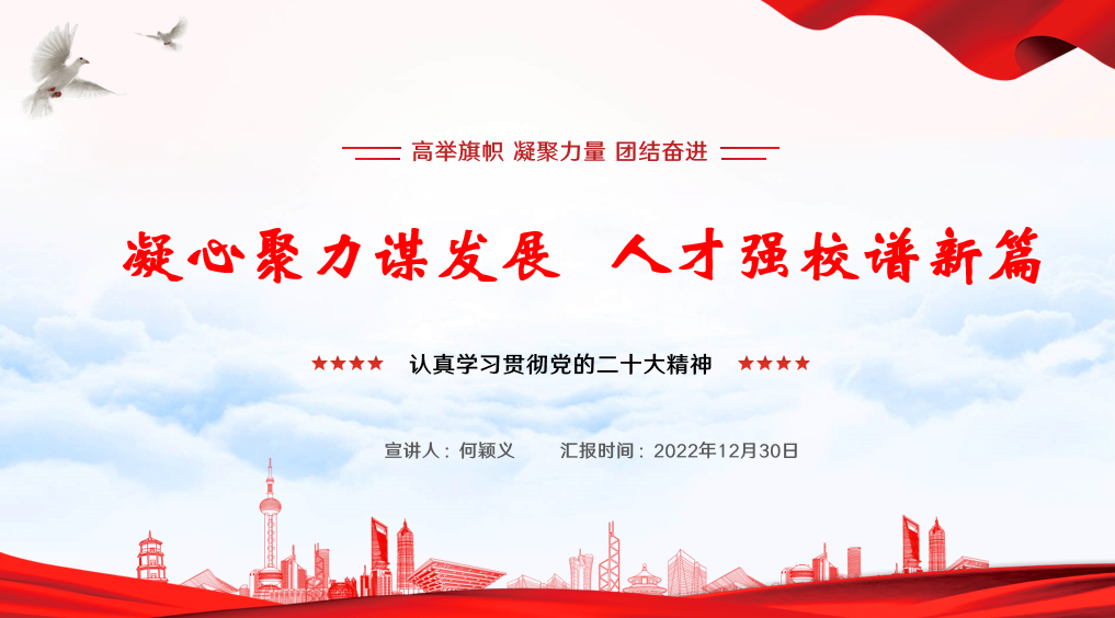 何颖义以《凝心聚力谋发展,人才强校谱新篇》为主题作宣讲报告,他从党的二十大关键词、人才工作举措与成效、人才工作面临的主要问题及人才工作建设的重点任务几个方面进行了深入解读。何书记指出,要积极践行党的二十大精神,推动学校人才强效落地,强化服务,推动新时代高校人才工作迈上新台阶。