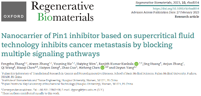 2023年2月27日,a片动画 杨达云副研究员课题组在Regenerative Biomaterials(中科院JCR一区)在线发表题为“Nanocarrier of Pin1 inhibitor based on supercritical fluid technology inhibits cancer metastasis by blocking multiple signaling pathways”的研究论文,该研究采用超临界流体技术制备了载Pin1抑制剂的PLA-PEG嵌段共聚物纳米微球,该纳米微球具有高的药物包封效率、优异的药物控制释放性能和好的生物安全性。该纳米微球不仅能够显著提高Pin1抑制剂对癌症生长的抑制作用,而且能够通过阻断多条信号通路和癌症上皮-间充质进展显著抑制癌症转移。由于该载药纳米微球能够将抑制癌细胞扩散和抑制癌症生长进行有效偶联,其为抑制癌症转移提供了新的治疗策略。