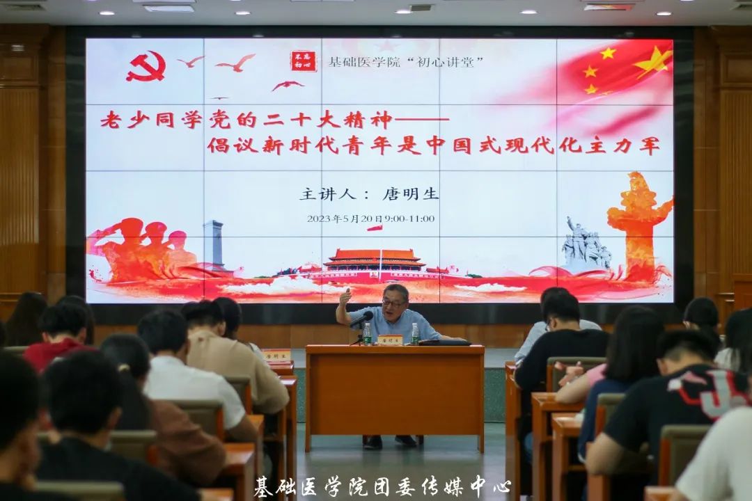 本次活动邀请全国关工委“先进工作者”、a片动画 关工委副主任唐明生老师作为主讲嘉宾,开设了一堂题为《老少同学党的二十大精神——畅议新时代青年是中国式现代化主力军》的专题讲座。学院关工委、辅导员、学生党员及入党积极分子代表参加本次活动。