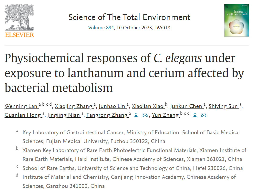 2023年6月21日,a片动画 张芳榕副研究员团队在Science of The Total Environment杂志(中科院JCR一区,IF=10.754)在线发表题为 Physiochemical responses of C. elegans under exposure to lanthanum and cerium affected by bacterial metabolism”的研究论文,该团队通过对不同浓度的稀土元素(镧、铈以及镧铈混合物)培养下的秀丽隐杆线虫(Caenorhabditis elegans)进行代谢组学分析,得到稀土元素在线虫体内呈现浓度依赖性蓄积,且低浓度范围促进生长,高浓度抑制生长及寿命。进一步经代谢组学数据结果分析得到,线虫上述的生理改变与稀土元素诱导的线虫体内的氨基酸代谢紊乱、膜紊乱和氧化应激等过程密切相关。并且在此基础上,探究了大肠杆菌代谢对稀土元素调控线虫所起的关键作用。该工作强调了稀土元素暴露下生物体内代谢水平的改变,深入了解稀土元素在代谢水平上的生物学影响。