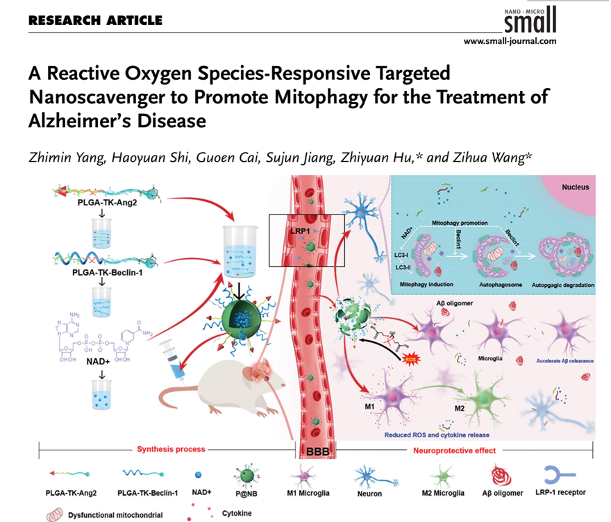 近日,a片动画 王子华副研究员和胡志远研究员团队在材料学TOP期刊Small (中科院JCR一区,IF=15.15)在线发表题为A Reactive Oxygen Species-Responsive Targeted Nanoscavenger to Promote Mitophagy for the Treatment of Alzheimer’s Disease”的研究论文。在该研究中,作者制备了一种ROS 响应的聚合物纳米载体P@NB,内部负载烟酰胺腺嘌呤二核苷酸 (NAD+),纳米载体表面修饰Beclin1多肽和Ang2多肽。通过恢复自噬通量加速Aβ降解并减轻过度炎症反应,从而改善AD小鼠的认知障碍。该研究表明,通过协同作用诱导自噬/线粒体自噬,使线粒体功能障碍正常化是一种有前途的AD治疗策略。