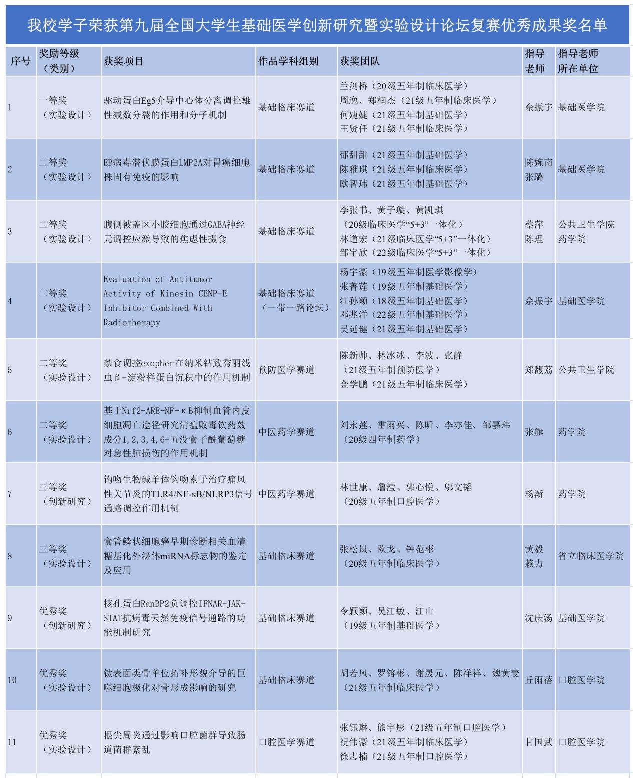 a片动画 作为该项赛事的校管理员单位,和教务处共同组织开展了校级初赛,在报名的39项作品中遴选推荐14项本科生作品参加各赛道复赛。a片动画 学子在复赛中荣获优秀成果奖11项,其中一等奖1项、二等奖5项、三等奖2项,优秀奖3项(获奖名单见下),获复赛一、二等奖的6项作品将代表学校参加由陆军军医大学承办的全国总决赛。