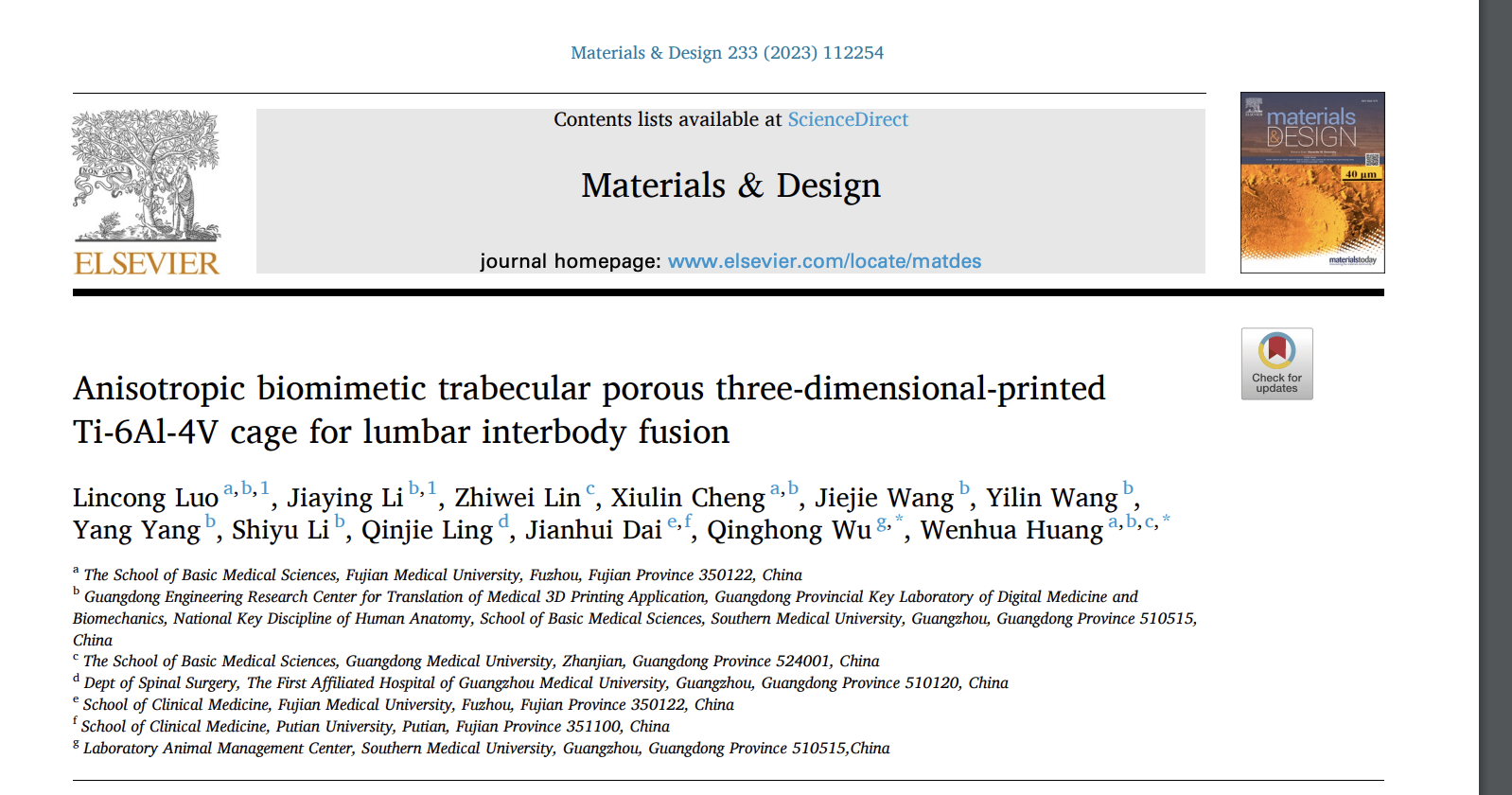 近日,a片动画 客座教授黄文华团队在用于治疗退行性腰椎疾病3D打印椎间融合器方面取得进展,所撰写论文Anisotropic biomimetic trabecular porous three-dimensional-printed Ti-6Al-4V cage for lumbar interbody fusion(用于治疗退行性腰椎疾病的一种新型3D打印各向异性仿生骨小梁多孔Ti-6Al-4V椎间融合器)在Top期刊Materials & Design(《材料与设计》)以研究长文(Research Article)形式在线发表,该期刊2023年影响因子为8.4。