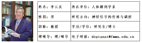 李云庆,男,1961年8月出生,河南新野人,博士研究生,空军军医大学教授/a片动画 客座教授,博士生导师。现任中国解剖学会理事长、国际解剖学工作者协会联盟(IFAA)副主席、国际形态科学大会(ICSMS)和亚太地区解剖学会(APICA)执委、《神经解剖学杂志》主编、国际期刊《Frontiers in Neuroanatomy》副主编,国际期刊《Molecular Pain》、《Journal of Chemical Neuroanatomy》编委等职务。国务院学位委员会学科评议组第八届学科评议组成员。