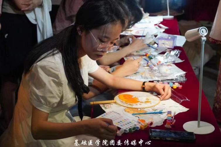 团扇DIY创意制作活动在此次游园中俘获了许多同学的“芳心”。同学们在灯光下描摹着团扇上的图案,认真的脸庞与温柔的月光相映衬,为热闹的夜晚添加了一丝静谧。
