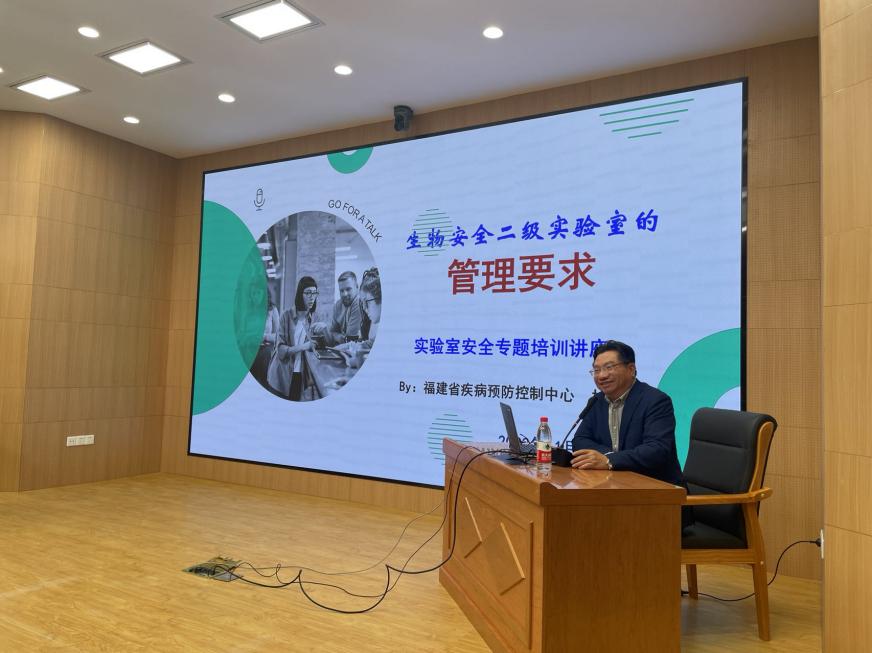 首先在实验室安全专题讲座环节,特别邀请了福建省疾病预防控制中心卫生检验检测所原所长林仲主任技师做了关于《生物安全二级实验室的管理要求》的专题讲座。林仲主任从实验室生物安全相关法律法规、实验室生物安全管理体系实验室级别、个人防护、消毒灭菌注意事项、废弃物处置五个方面介绍了生物实验室的安全隐患及事故分析。