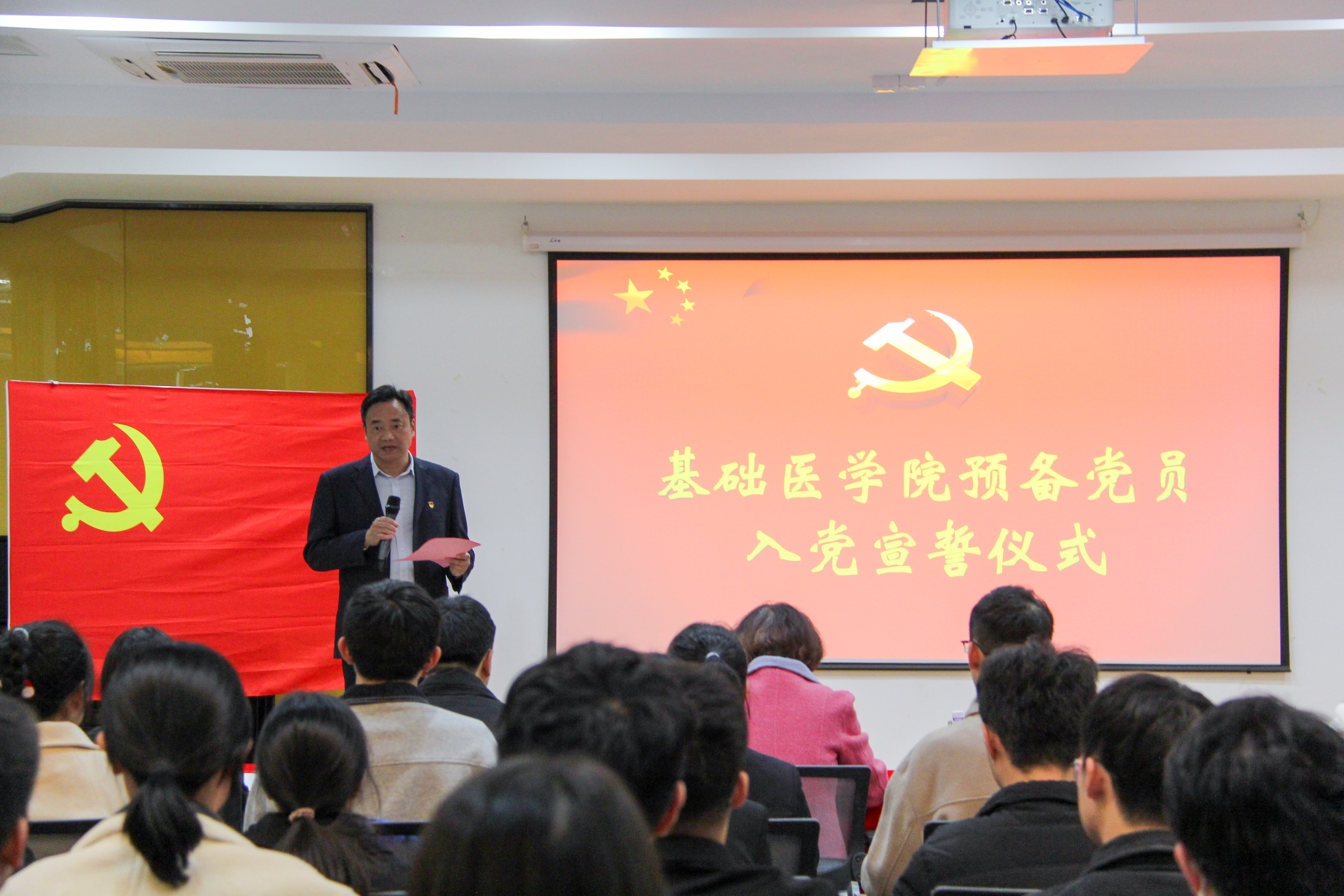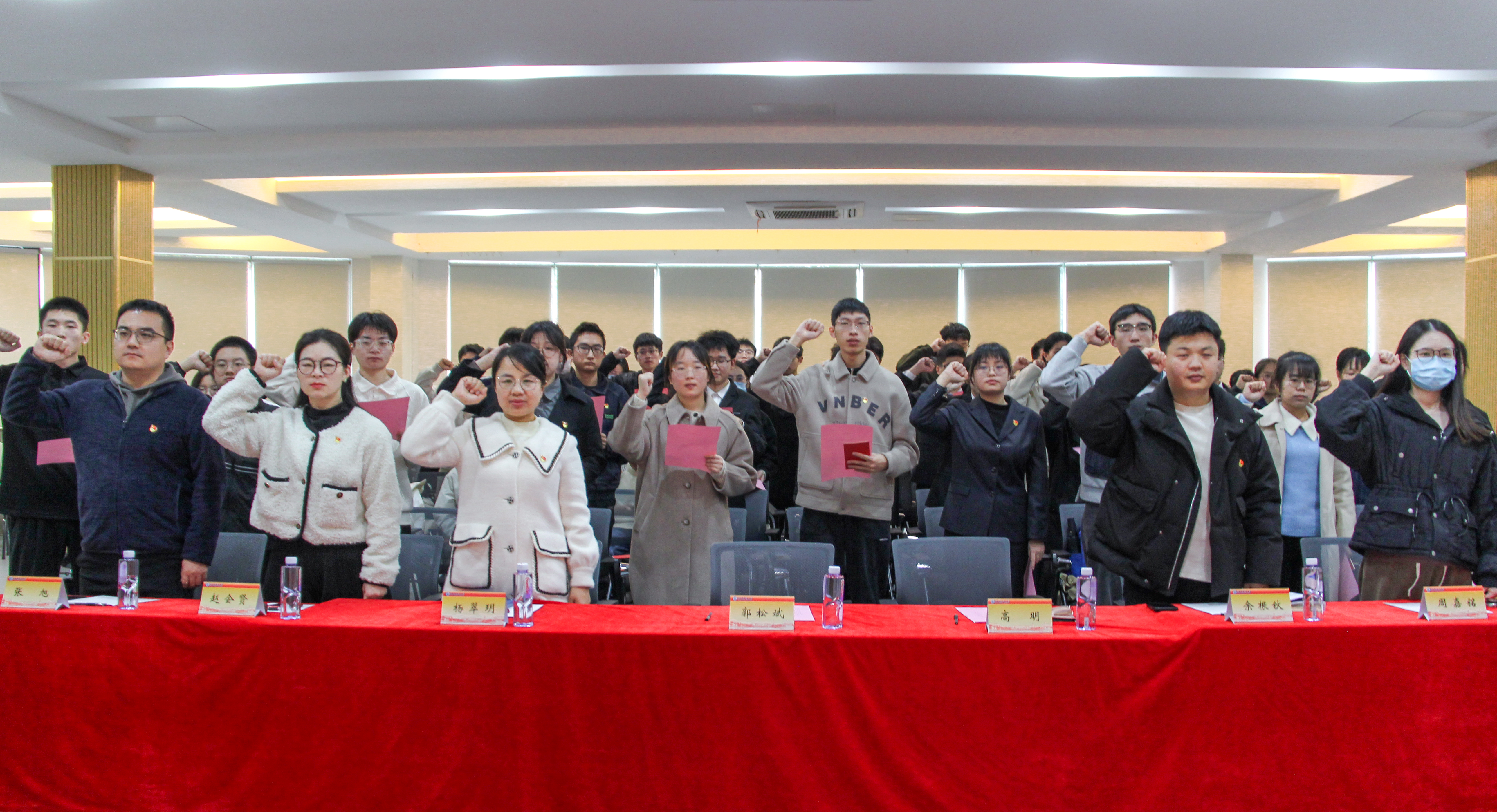 1月2日下午,a片动画 党委在学生社区举办预备党员入党宣誓仪式。学院党委书记郭松斌,副书记高明,学工办副主任、分团委副书记杨翠玥,党支部书记代表和入党积极分子代表出席本次仪式,共同见证50位新发展预备党员在党旗下庄严宣誓。