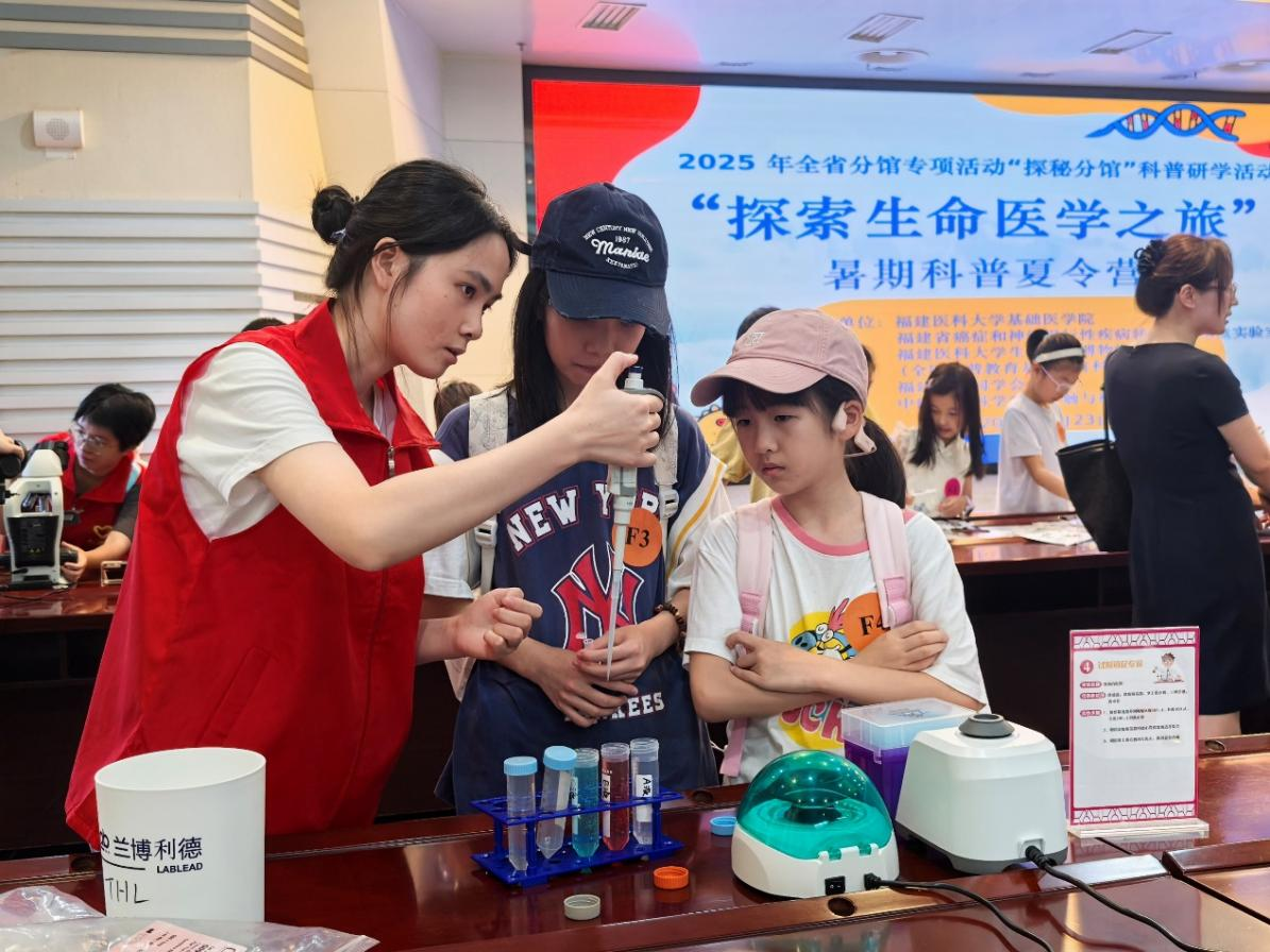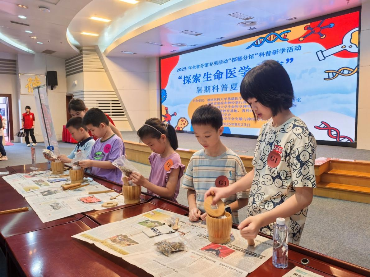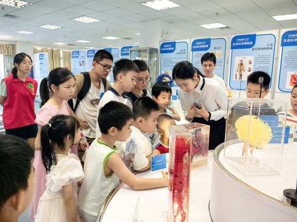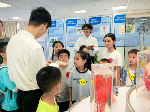 2025年8月23日,a片动画 旗山校区迎来了一批可爱的“探险小队员”——由a片动画 联合福建欧美同学会及神经科学学会突触与神经可塑性分会等多家单位主办的“探索生命医学之旅”暑期科普夏令营,吸引了校内外家长、福建省欧美同学会成员等上百组中小学生家庭热情加入。夏令营在教育部医药基础研究创新中心和全国科普教育基地开展,包含生命医学科普课堂、实践互动课堂和探秘实验室等三大环节,共有上午和下午两个场次,以一个个兼具趣味性与科学性的游戏和实验,带领小朋友们开启和体验了一段充满神秘与惊喜的生命医学探索之旅。