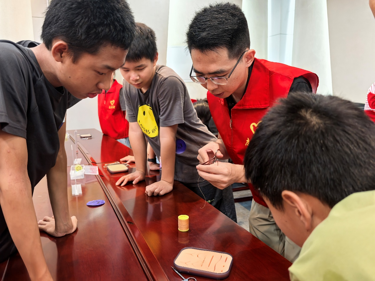 “小小手术师”环节里,在专业临床医师的现场示范和指导下,中学生们手握持针器和镊子,在仿真皮肤模型上完成了人生第一次“一字缝合”操作。来自福州一中高一的刘同学在成功缝5针后感慨地说道:“看上去缝合好像很简单,但真正操作起来我的手一直在抖,医生真的不容易呀!”