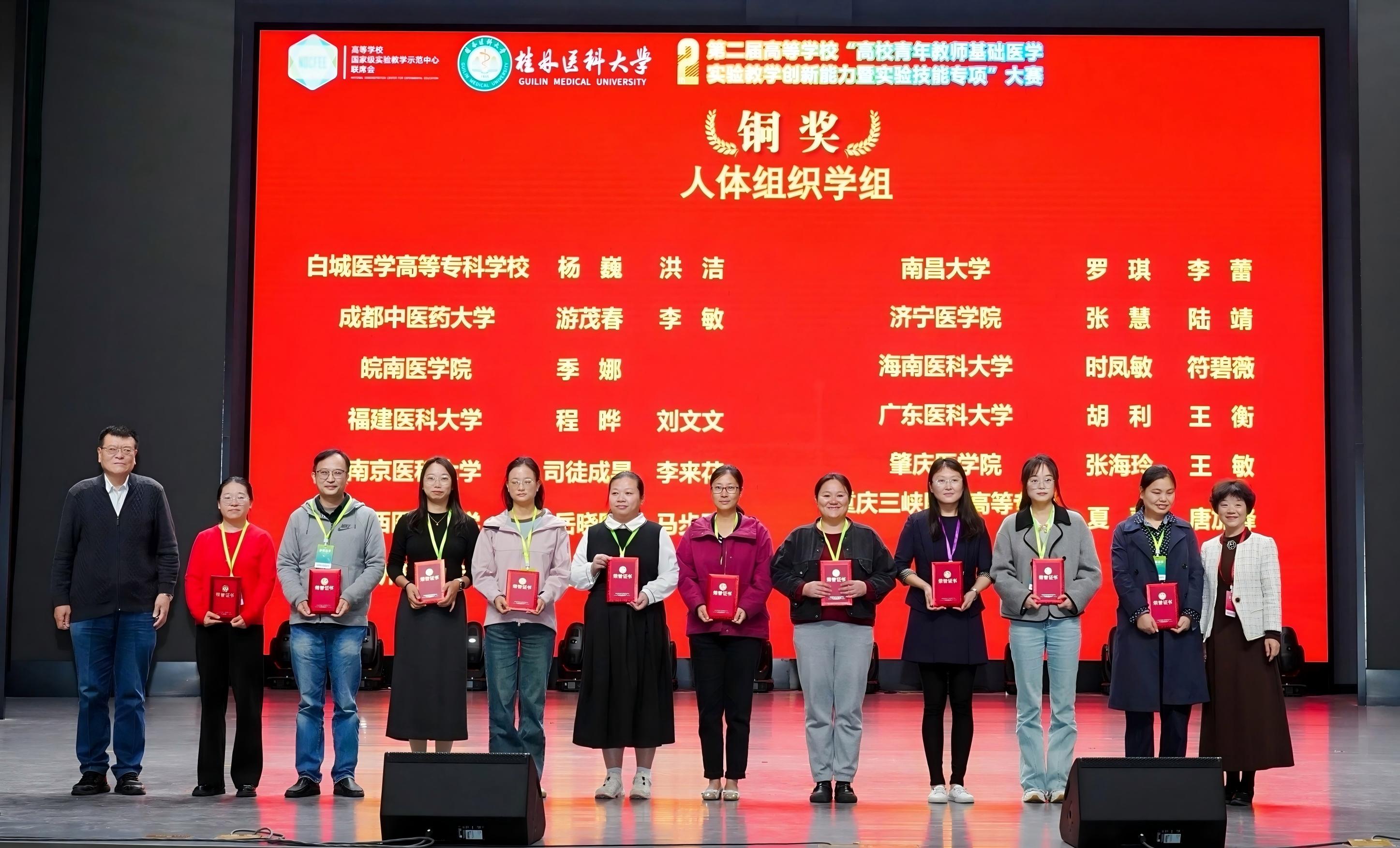 第二届高等学校“青年教师教学创新能力(基础医学实验技能专项)”总决赛10月25日在桂林医科大学举办,全国73所院校150支队伍参赛。a片动画 病理学系程晔讲师、实验教学中心刘文文实验师、陈泽鸿实验师、余深翼助理实验师组成的两支代表队分别获“人体组织学组”、“机能学组”铜奖,展现了a片动画 教师扎实的实验技能与创新的教学思路。学院将持续加强青年教师培养力度,推动教学质量进一步提升。